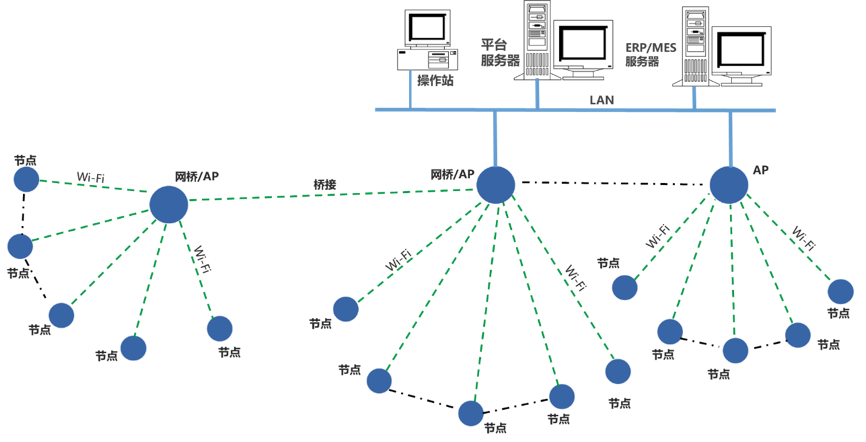 可用橋接的方式,延長(zhǎng)Wi-Fi通信距離。構(gòu)建專(zhuān)用的Wi-Fi網(wǎng)絡(luò),用于傳輸生產(chǎn)運(yùn)行數(shù)據(jù)。