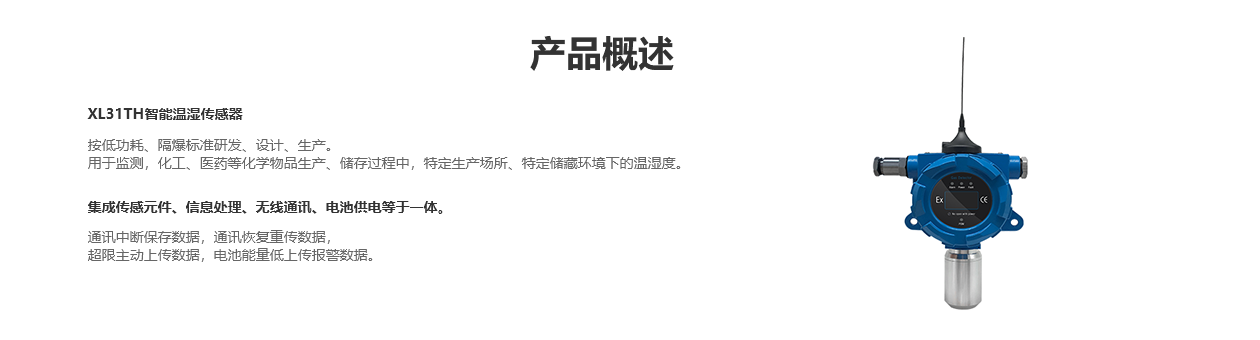 XL31TH智能溫濕傳感器,是按低功耗、隔爆標準研發、設計、生產。用于監測,化工、醫藥等化學物品生產、儲存過程中,特定生產場所、特定儲藏環境下的溫濕度。