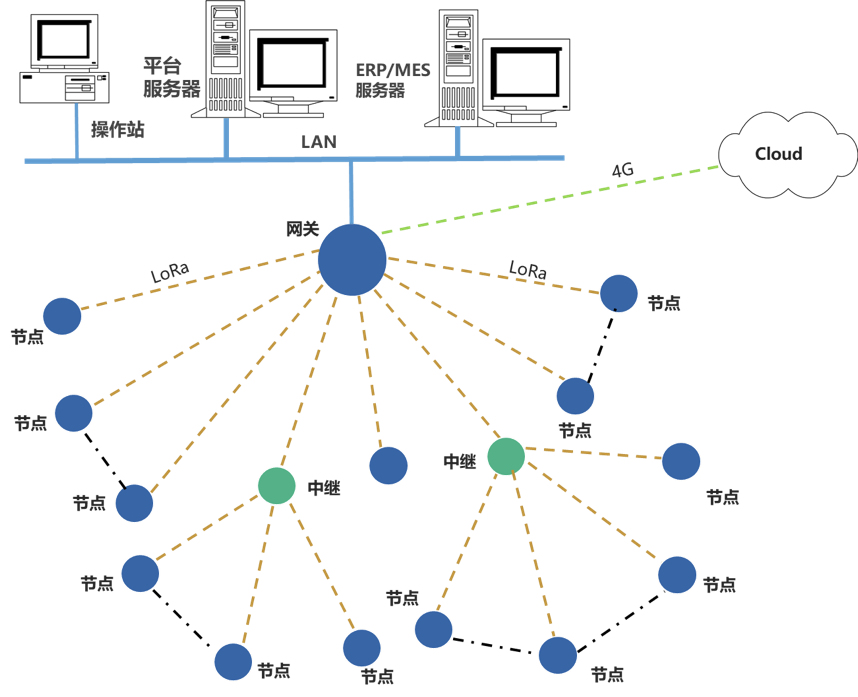 LoRa網(wǎng)絡(luò)是自定義通訊參數(shù)的LoRa通信網(wǎng)絡(luò);設(shè)計(jì)有中繼可延長無線傳輸距離。物聯(lián)網(wǎng)關(guān)對節(jié)點(diǎn)的數(shù)據(jù)進(jìn)行通信協(xié)議轉(zhuǎn)換,可選多種通信接口、不同的通信協(xié)議,同時上傳數(shù)據(jù)至多個平臺服務(wù)器。