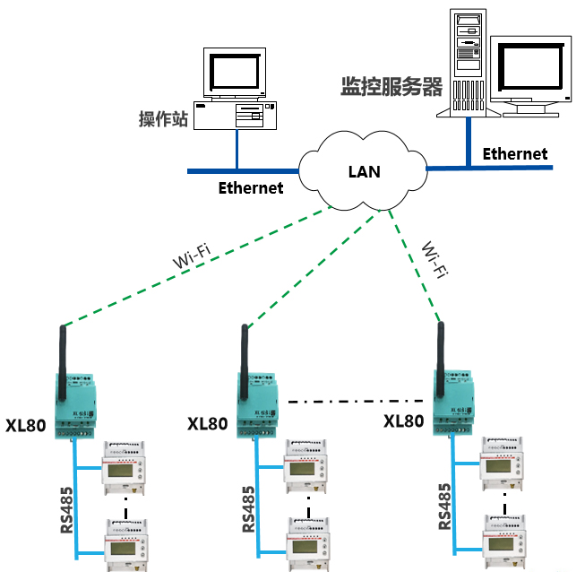 2、XL80智能主機,通過Wi-Fi接入LAN網(wǎng)絡(luò),支持MQTT、SOAP、API、Modbus、XL/9-IoT等等多種通信協(xié)議,接入EMS、MES、ERP等系統(tǒng),不支持協(xié)議對接的,可直接將數(shù)據(jù)寫入數(shù)據(jù)庫;