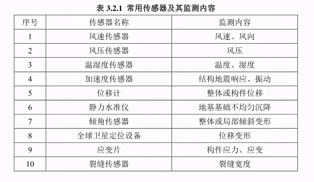作為結構檢測最為重要的內容,傳感器起到了最為關鍵的作用。從結構檢測常用的傳感器類型來看,風速傳感器、風壓傳感器、溫濕度傳感器、加速度傳感器、位移計、裂縫傳感器這些都是必備的,常用的傳感器及監測指標見下圖