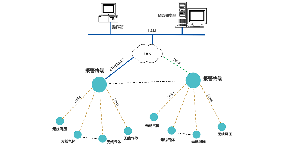 3. 報警終端無線讀取監測點上傳的數據,進行處理、顯示、報警;并將數據通過局域網,MQTT協議,上傳至MES。
