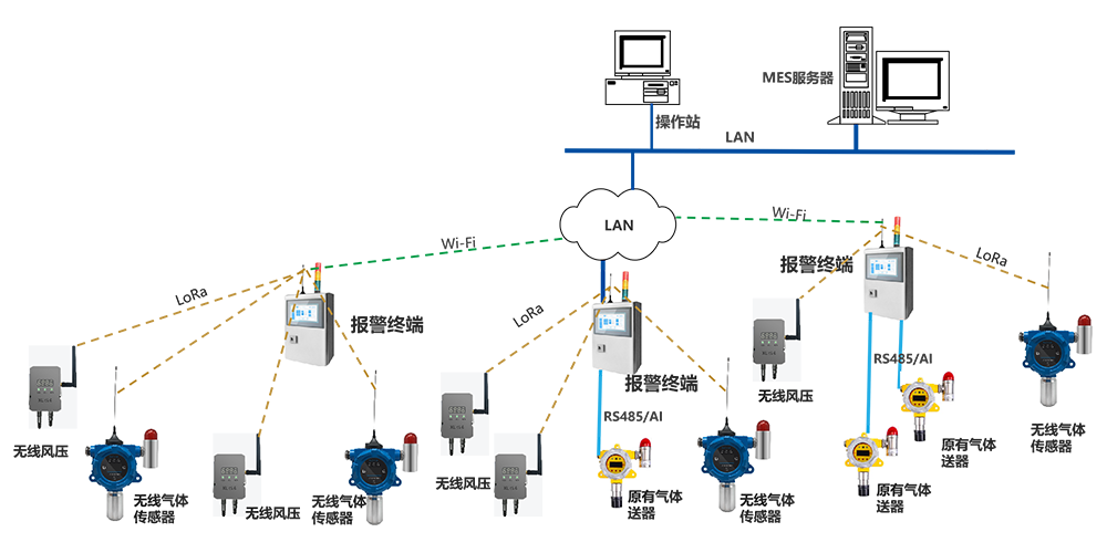 4. 原有的氣體傳感器,通過有線方式接入分布安裝的報警終端;支持RS485、DC4-20mA、DC0-5V、Ethernet等方式接入。