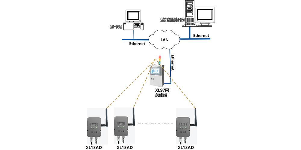 4. 現場需要局部集中監視時,可配置XL97網關終端,讀取區域內XL13AD上傳的數據,分析處理、顯示、報警,并轉發至監控中心服務器。