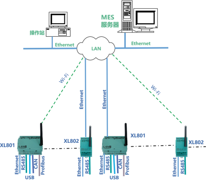 XL80通信主機,從設備通信接口,讀取設備或系統的運行數據,通信協議轉換處理后,再通過Ethernet或Wi-Fi,接入LAN,轉發數據至MES。