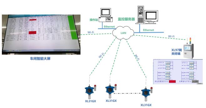 采用無線通信方式,同時(shí)在多個(gè)位置設(shè)置監(jiān)視及聲光報(bào)警點(diǎn),例如可在危險(xiǎn)環(huán)境空間入口、值班室設(shè)置數(shù)據(jù)監(jiān)視及聲光報(bào)警點(diǎn),在車間、工廠大屏上實(shí)時(shí)顯示有毒有害氣體濃度數(shù)據(jù)。