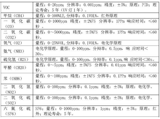 l 提供氨氣(NH3)、硫化氫(H2S)、氧氣(O2)、氫氣(H2)、二氧化碳(CO2)、甲烷(CH4)、一氧化碳(CO)、二氧化氮(NO2)、甲醛(CH2O)、氟化氫(HF)、二氧化硫(SO2)、六氟化硫(SF6)、苯(C6H6)、甲苯(C7H8)、二甲苯(C8H10)、乙醇(C2H6O)、揮發(fā)性有機(jī)化合物(VOC)等氣體傳感器,且不限于上述氣體種類。