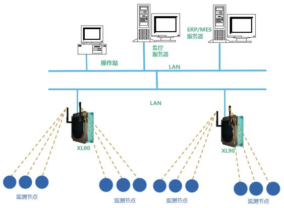 解決方案:XL90物聯(lián)網(wǎng)關(guān)無(wú)線讀取監(jiān)測(cè)節(jié)點(diǎn)的數(shù)據(jù),進(jìn)行處理、協(xié)議轉(zhuǎn)換,通過(guò)以太網(wǎng)(Ethernet)或Wi-Fi,接入局域網(wǎng)轉(zhuǎn)發(fā)數(shù)據(jù)至MES、ERP、EMS等工廠數(shù)字化平臺(tái)。