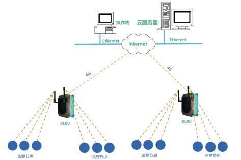 解決方案:XL90物聯(lián)網(wǎng)關(guān)無(wú)線讀取監(jiān)測(cè)節(jié)點(diǎn)的數(shù)據(jù),進(jìn)行處理、協(xié)議轉(zhuǎn)換,采用4G通信方式將數(shù)據(jù)直接推送至云平臺(tái)。