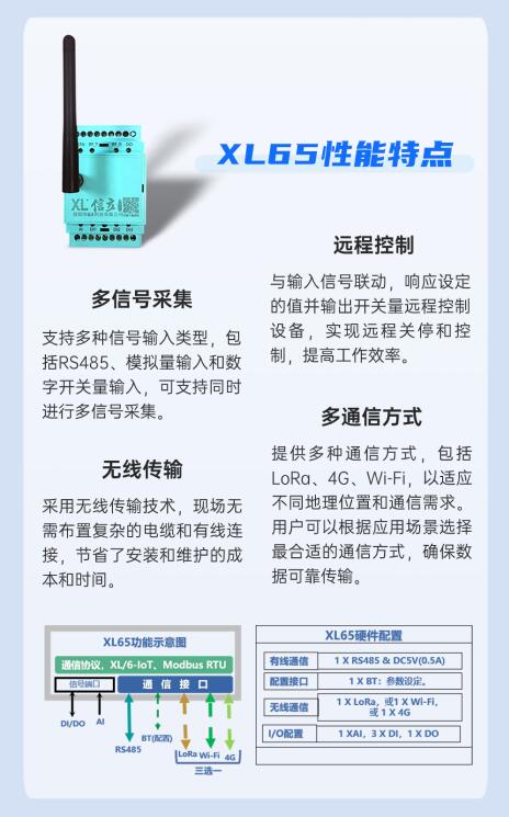 設(shè)備選型:選擇XL65無線采集器,配置DI、AI、RS485等輸入,從機(jī)器設(shè)備上采集狀態(tài)信號(hào),從而獲取基礎(chǔ)數(shù)據(jù);并配DO輸出,可下發(fā)控制、通知、呼喚等信號(hào)。