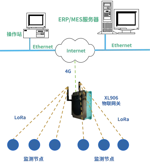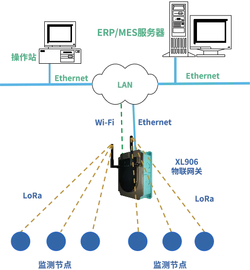 XL906物聯網關,無線讀取監測節點的數據,進行處理、協議轉換,通過以太網(Ethernet)或Wi-Fi,轉發數據至MES、ERP、EMS等多個工廠數字化平臺,實現數據聯網、集中監控分析。