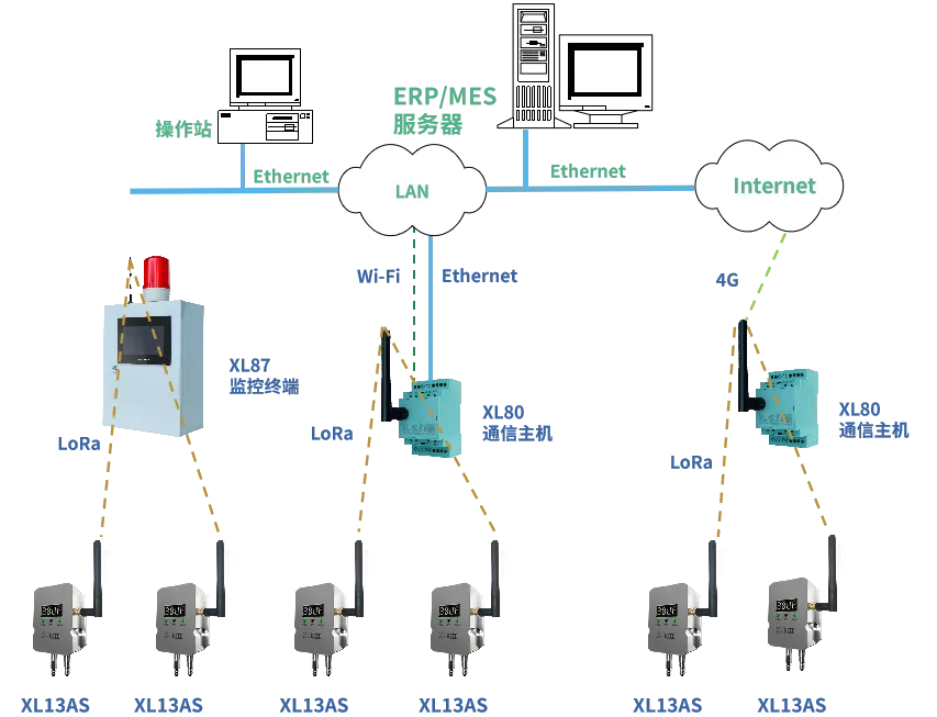 XL13AS無線風管風速傳感器通過LoRa無線傳輸方式,將數據上傳至XL802通信主機,通信主機可選以太網、Wi-Fi4G通信方式,推送數據至監控平臺、企業生產管控服務器等。